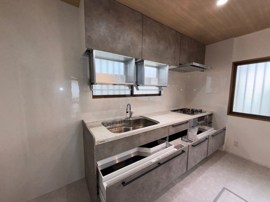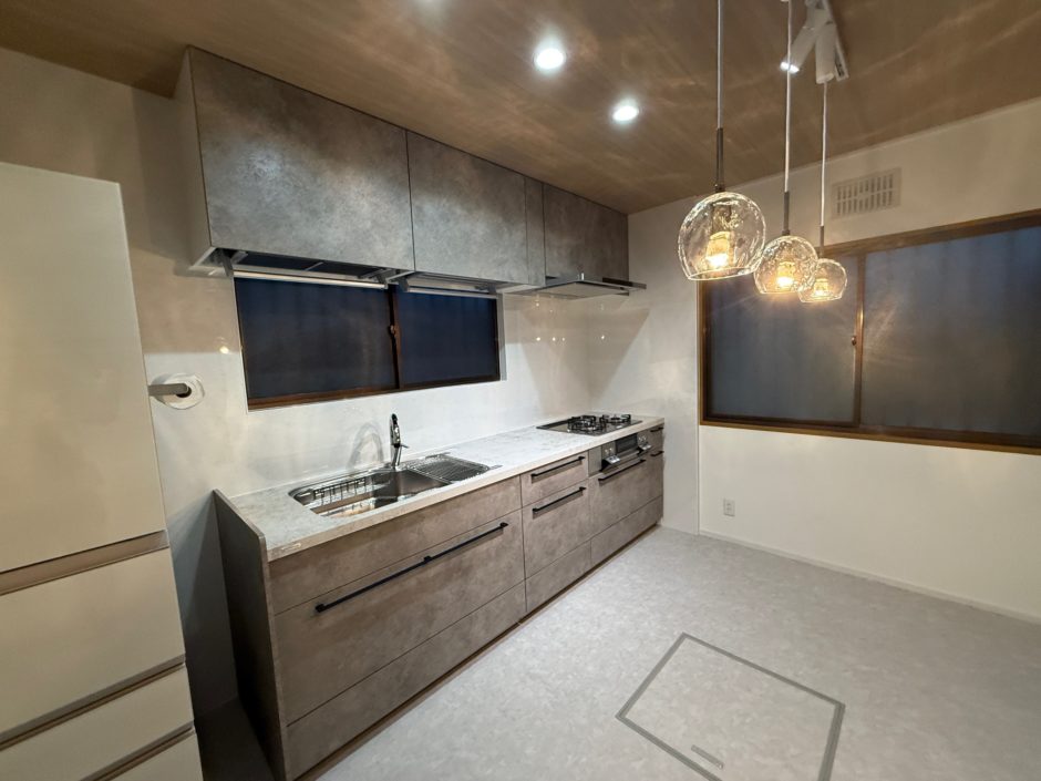 床板の貼替とキッチンの交換、勝手口の交換などを行いました。